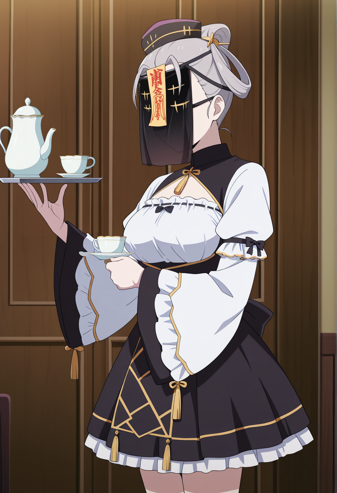 长发、灰发、发环、面纱、短裙、女仆装、长袖、宽袖、符咒、小帽子