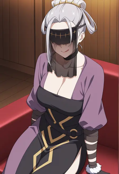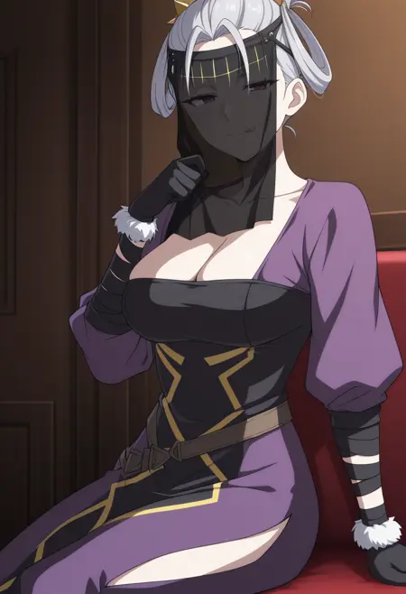 长发、灰发、发环、面纱、长裙、露胸、腰带、臂缠、毛皮镶边手套