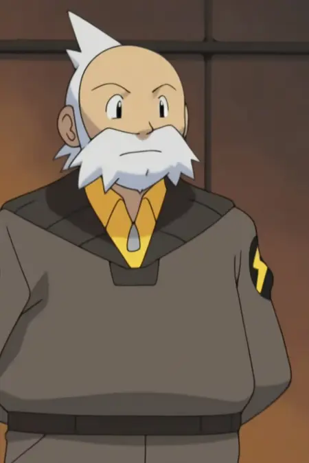 노란 커버올, 갈색 재킷, 어깨에 번개 무늬 패치, 갈색 신발,