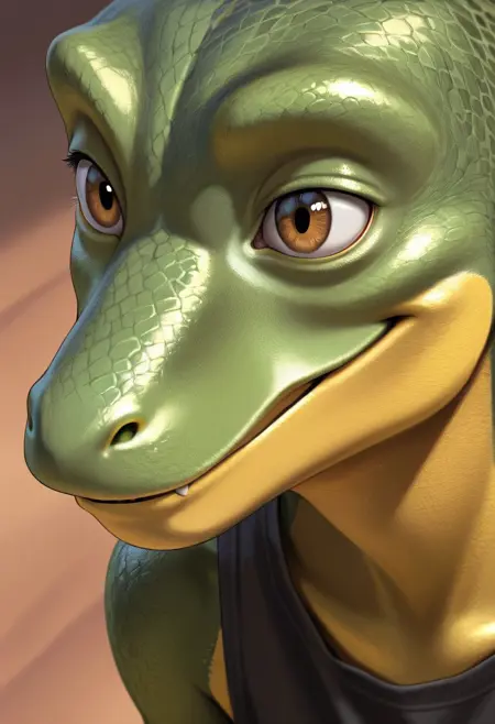 1boy, male, Jacko, animal, reptile, lizard, lizard tail, frilled dragon, green skin, black tank top, brown eyes