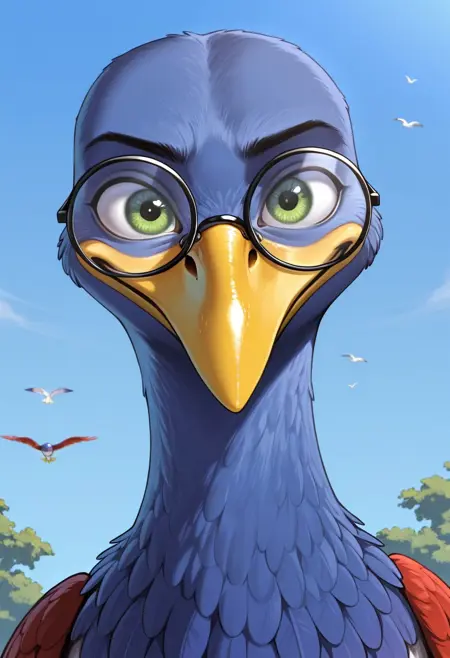 1boy, bird, animal, blue feathers, red wings, white belly, bird tail, yellow beak, bird feet, 3 toes, yellow feet, green eyes, glasses, round glasses