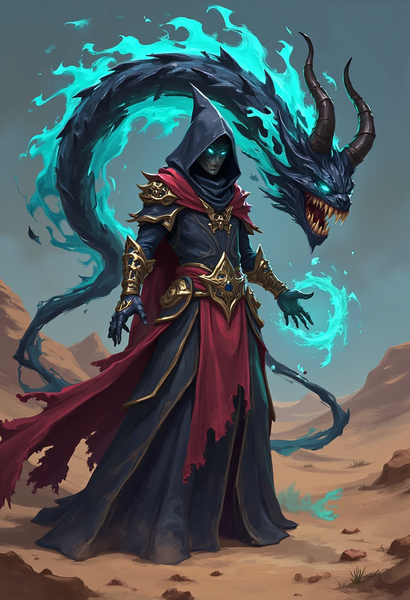 带有魔法元素的奇幻角色设计,一位与虚空恶魔缔约的术士,斗篷翻涌着深渊能量,在被诅咒的沙漠中召唤黑暗符文。