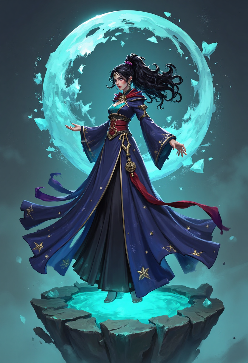 带有魔法元素的奇幻角色设计,一位身着飘逸星纹长袍的女法师,施法时形成月形光环,立于漂浮的水晶岛屿之上。