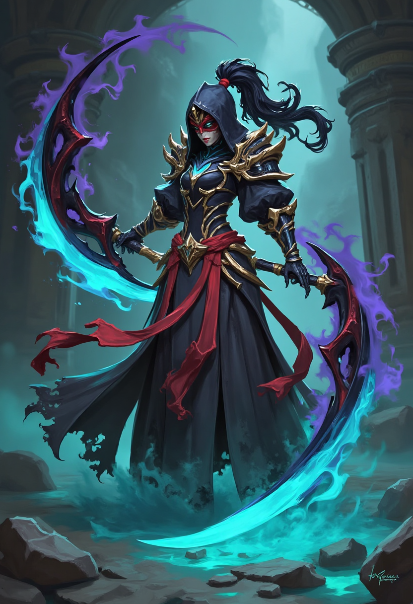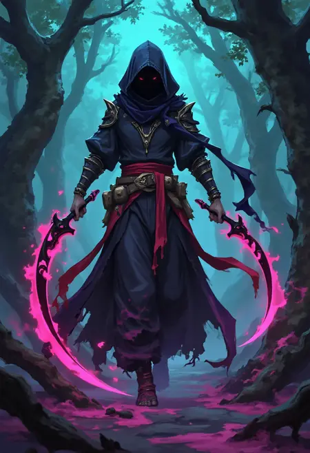 带有魔法元素的奇幻角色设计,一位身披阴影浸染斗篷的盗贼,短刃滴落霓虹色魔法,于黄昏时分潜行于 enchanted 森林中。