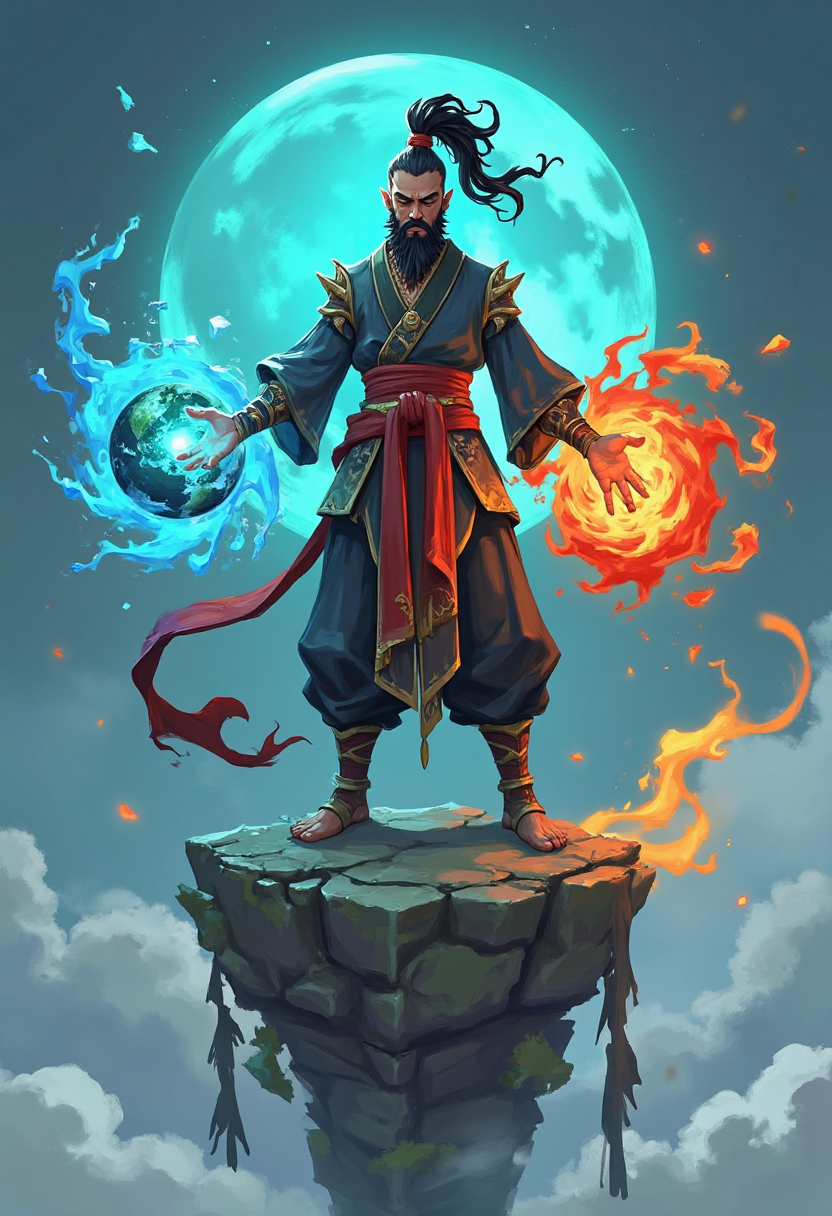 带有魔法元素的奇幻角色设计,一位传导元素气的僧侣,双拳闪耀着土、风、火、水之力,于悬浮于空中的石柱上冥想。