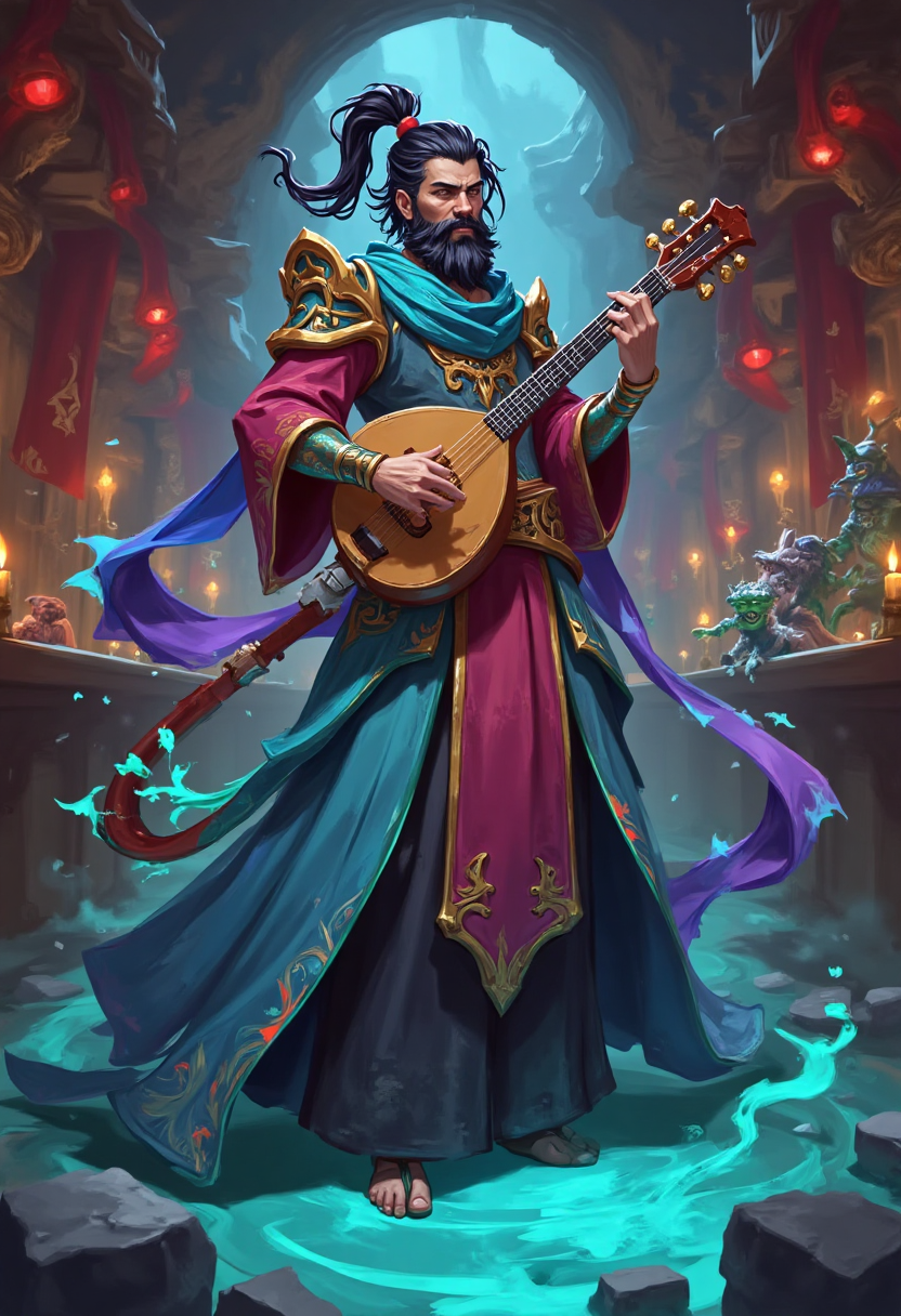 带有魔法元素的奇幻角色设计,一位竖琴奏出旋律幻象的吟游诗人,衣袍由彩虹色咒语编织而成,在充满精灵的魔法酒馆中表演。