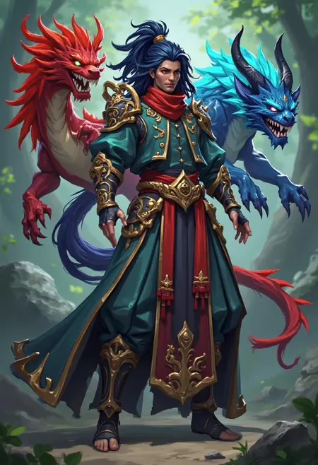 带有魔法元素的奇幻角色设计,一位驾驭众多神话生物的驯兽师,服饰绣有召唤兽类的符文,置身于生机勃勃的魔法动物园中。