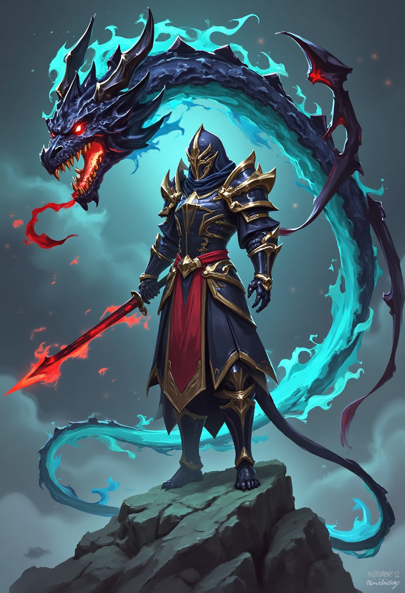 带有魔法元素的奇幻角色设计,一位与幽灵龙融合的骑士,铠甲由星界金属锻造,吐息宇宙之火,站立于风暴肆虐的山巅。