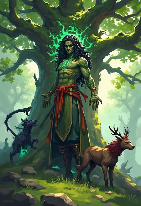 带有魔法元素的奇幻角色设计,一位与有意识巨树相连的德鲁伊,皮肤上布满树皮般的符文,在阳光斑驳的林间空地中召唤动物灵卫。