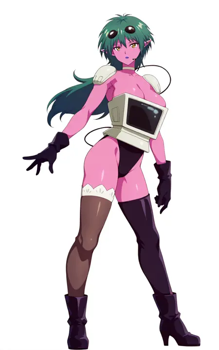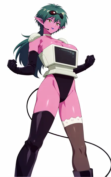 upaskon, 1girl, solo, green hair, pink skin, pointy ears, gloves, colored skin, monitor, retro artstyle, anime screencap, thighhighs, breasts, short hair, long hair, microphone, boots, leotard, elbow gloves, goggles, cable