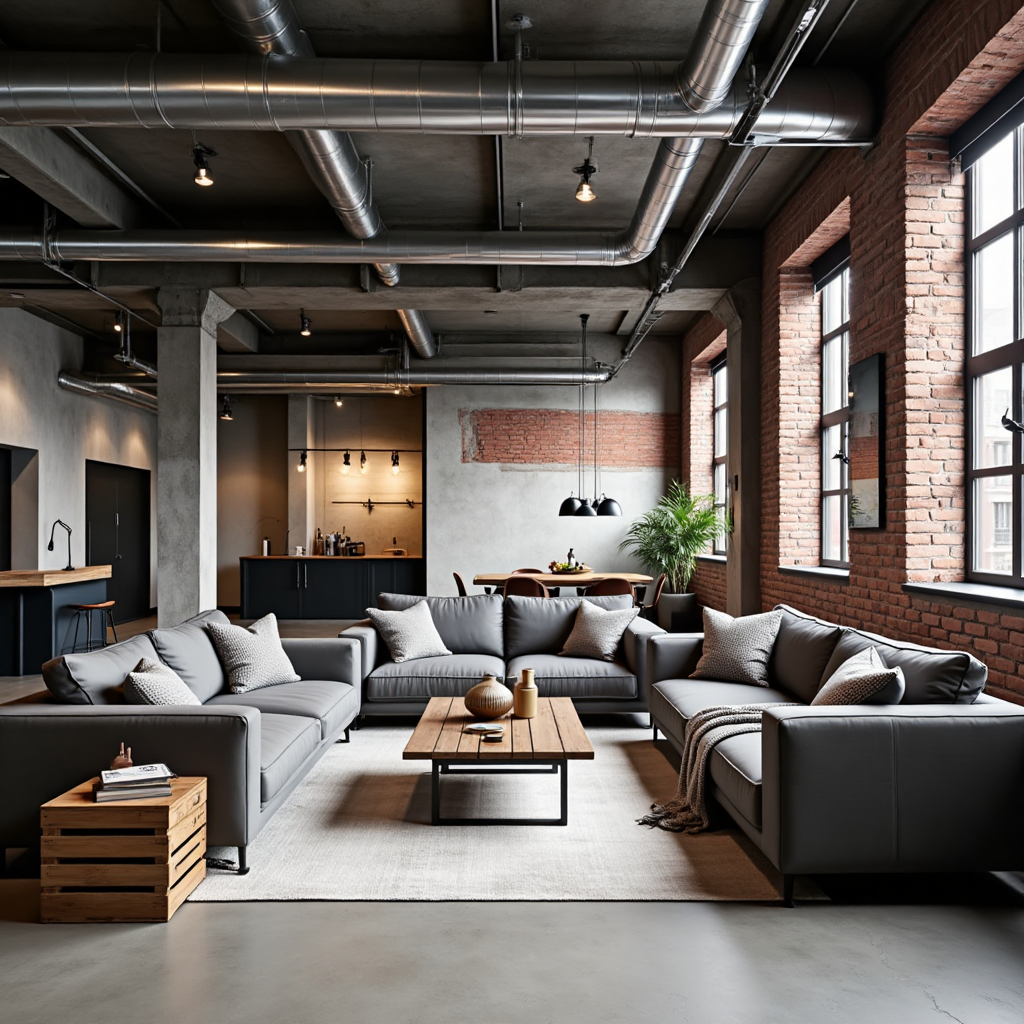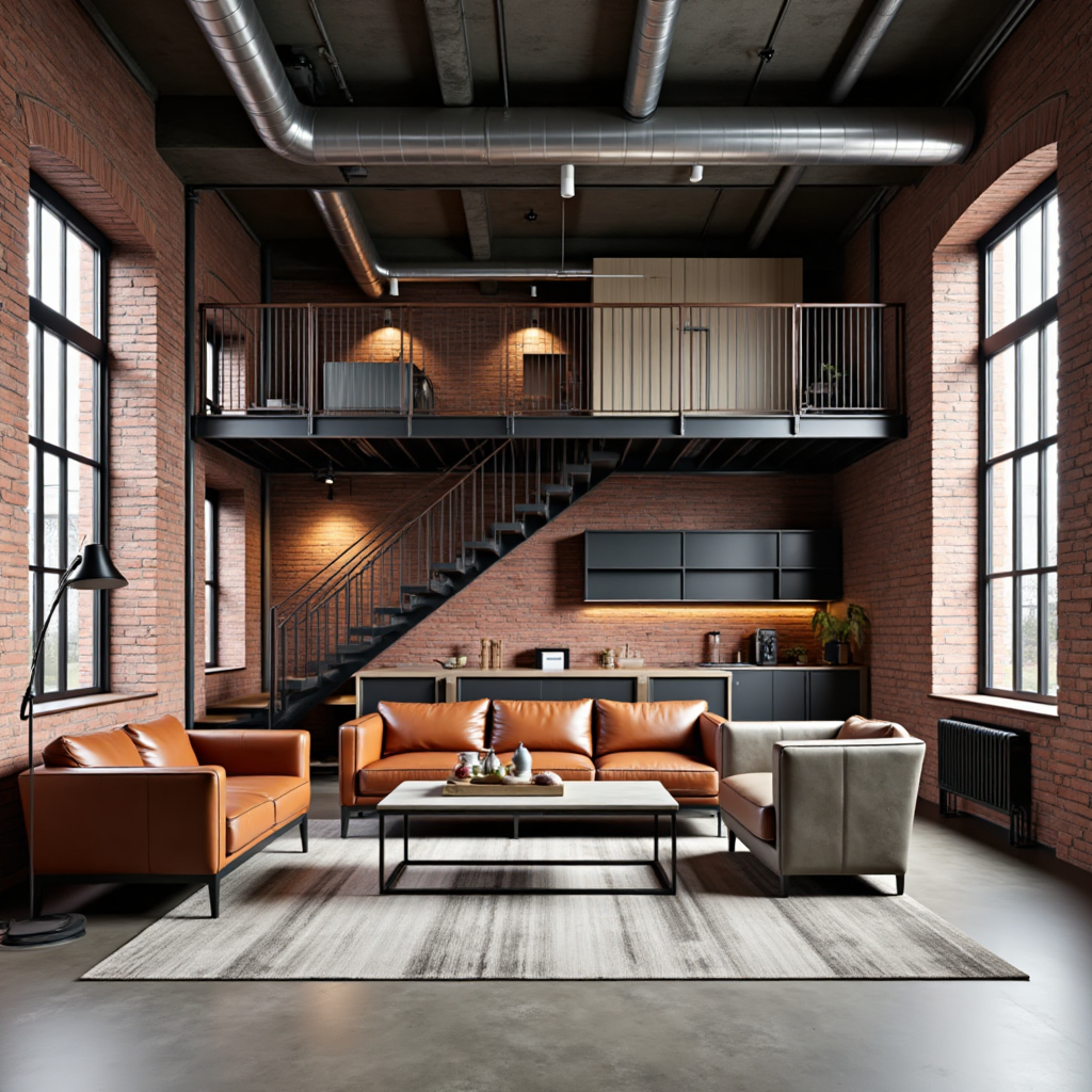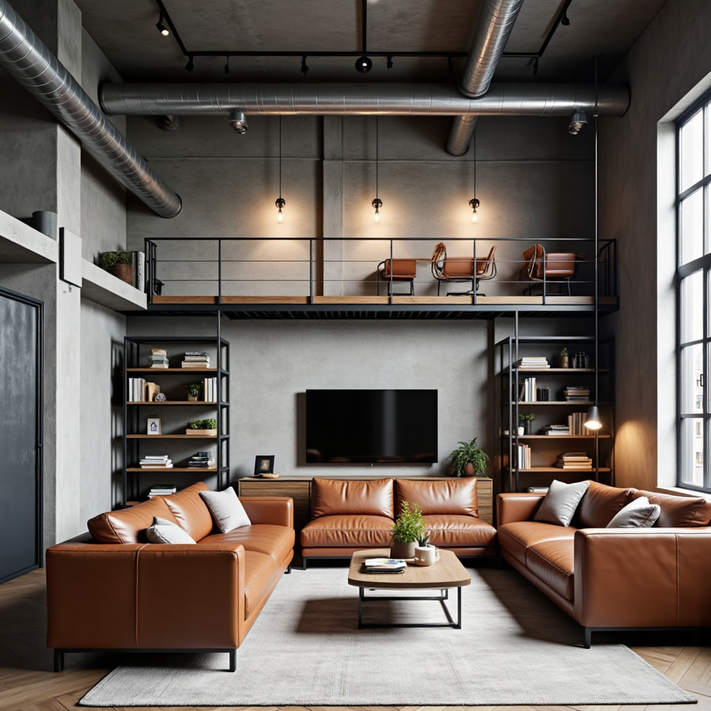 5. 工业风格室内设计,高天花板房间,混凝土墙面,金属与木制搁架,皮质沙发,工业吊灯。