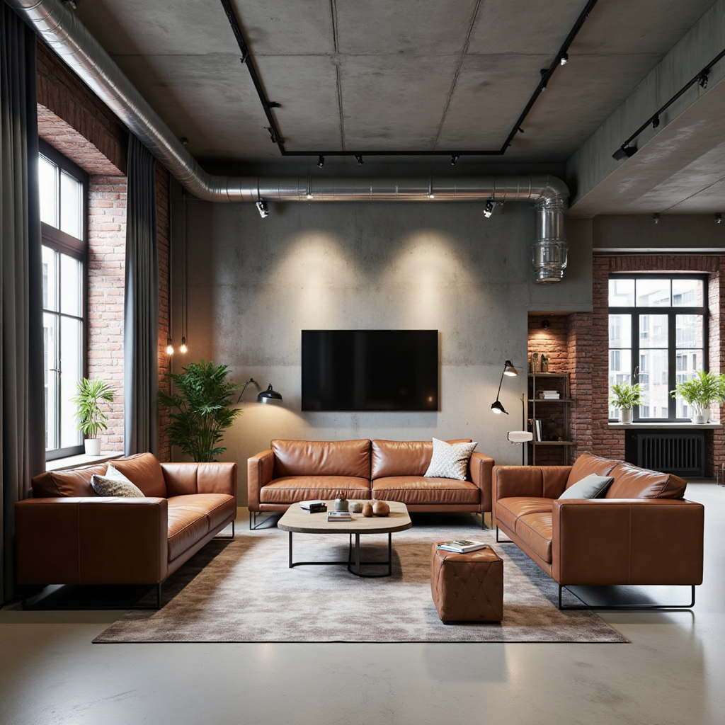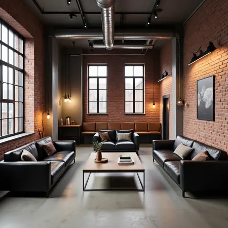 1. 工业风格室内设计,裸露砖墙,混凝土地板,深色皮质沙发,金属框架咖啡桌,配以爱迪生灯泡的吊灯。
