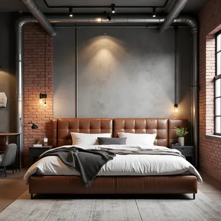 6. 工业风格室内设计,城市阁楼,砖与混凝土混合,金属家具腿,皮质床,爱迪生灯泡吊灯。