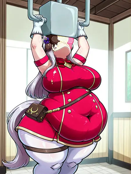 트리거 단어: , 아이스크림 기계, 네이폴리탄 아이스크림, 팔을 위로, 기계를 잡는 모습, 눈 가린 상태, 입 가린 상태, 몸에 음식이 묻은 상태,