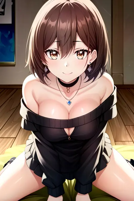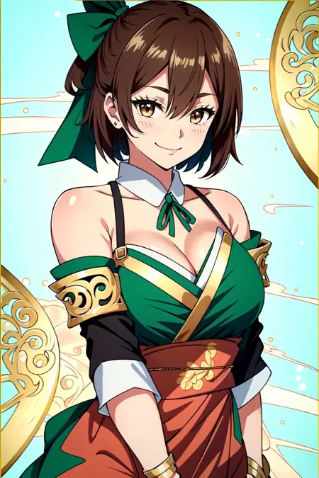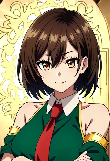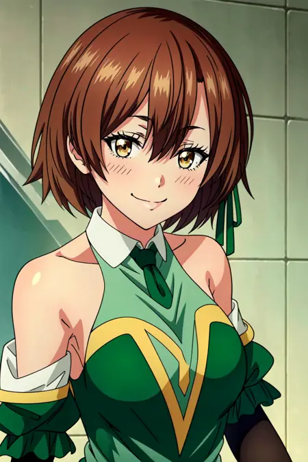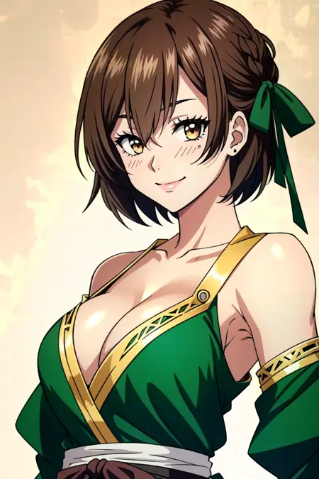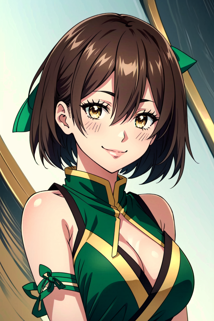 로라 메트로세, 1girl, solo, breasts, smile, brown hair, blush, cleavage, brown eyes, short hair, hair between eyes, bare shoulders, detached sleeves, green dress, hair ribbon, ribbon, bangs, green ribbon