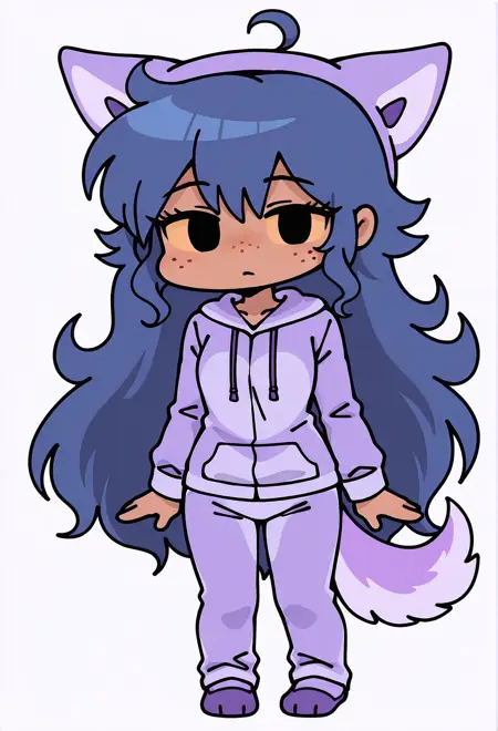 BSidesAutumnFNF, 1girl, black eyes, no sclera, tan skin, freckles, light blue hair, light purple dog pajamas, short, chibi