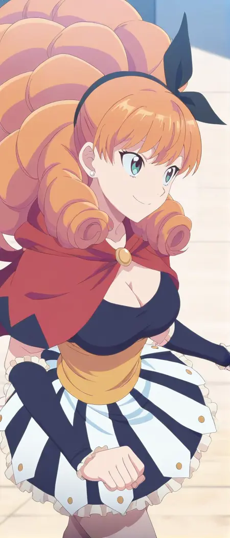 orange hair, blue eyes, earrings, long hair, drill hair, hair ribbon