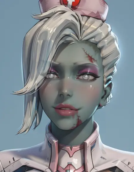 zombie doctor mercy, mercy (overwatch), white hair, white eyes, colored skin