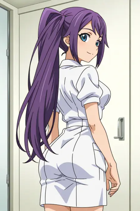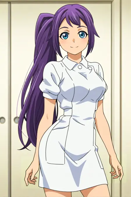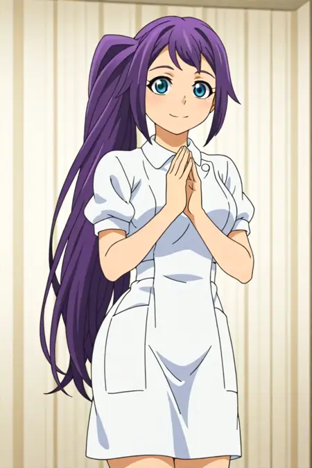Appearance: 1girl, solo, purple hair, long hair, blue eyes, side ponytail