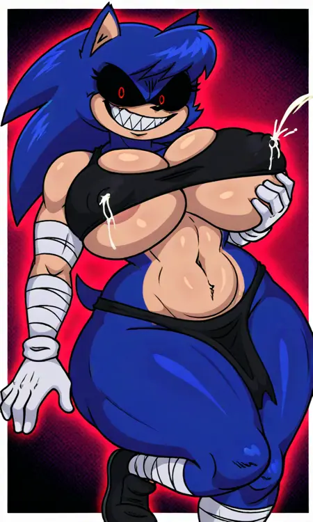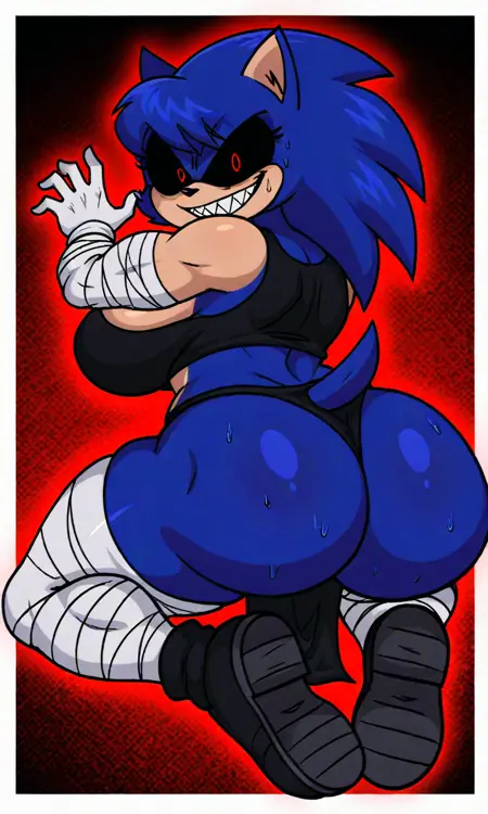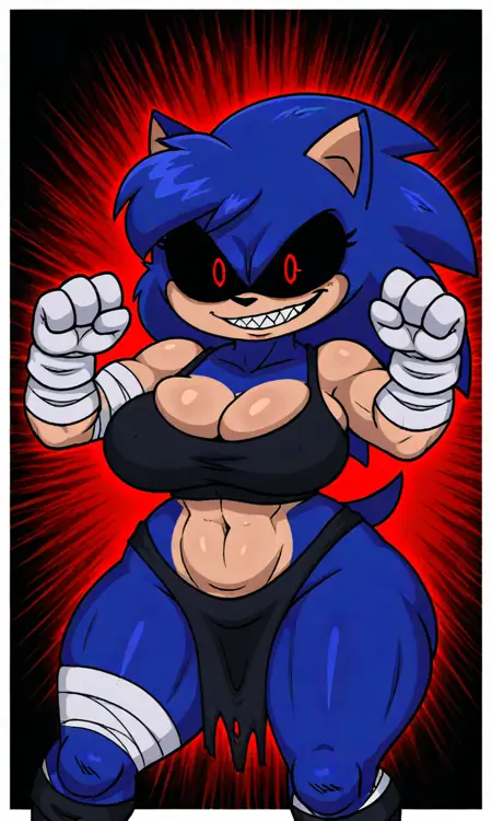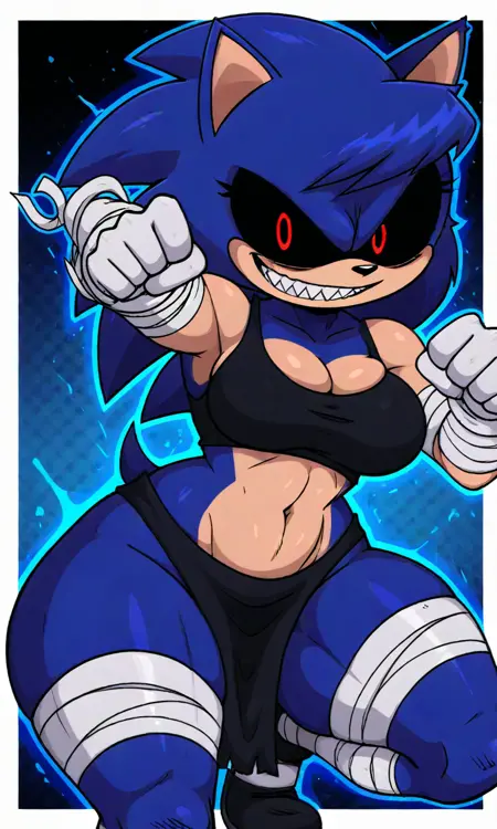 태그: B3ast, 고슴도치, 파란 털, 검은 공막, 붉은 동공, 날카로운 이빨, 흰 장갑, 검은 신발, 팔과 다리에 붕대, 검은 크롭탑, 검은 둔부감