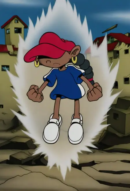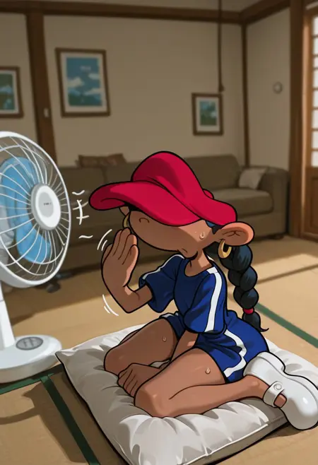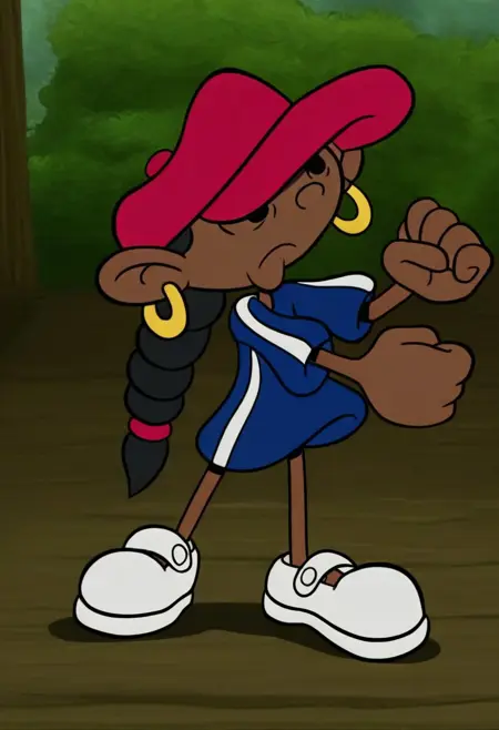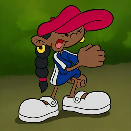 넘버5abi, 마른 체형, 흰 줄무늬가 있는 어두운 파란 셔츠 드레스, 빨간 모자, 금색 고리 귀걸이, 긴 단일 땋은 머리, 검은 머리카락, 검은 눈, 가린 눈, 흰색 메리제인 신발, 짙은 피부, 막대기 같은 다리, 카트oons 스타일의 아트,