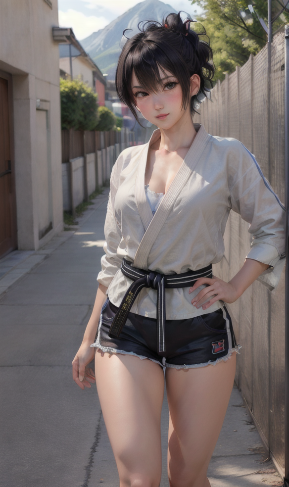short hair, black hair, shorts, barefoot, belt, bandages, bandaid, realistic, bandaid on leg, dougi, ankle wrap, martial arts belt, karate outfit