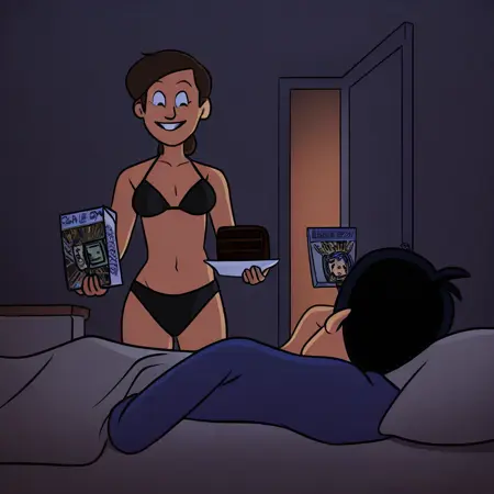 チョコケーキ、1人の少女、立っている、右手にケーキを持ち、左手に箱を持ち、笑顔、夜、ブラックビキニ着用、室内、開いたドア、1人の少年、少年がベッドにいる、少年が女性を見つめている、女性に集中、両手が忙しい