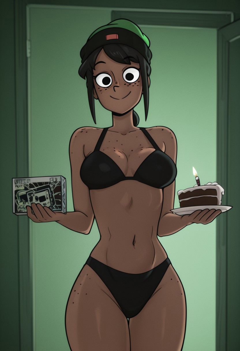 Chococakme,1个女孩,站立,右手拿着蛋糕,左手拿着盒子,微笑,夜晚,穿着黑色比基尼,室内,门开着,1个男孩,男孩躺在床上,男孩看着女人,女人是焦点,双手忙碌。