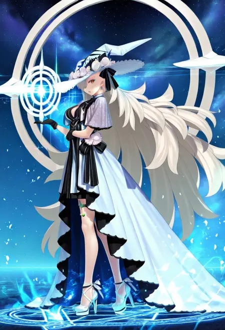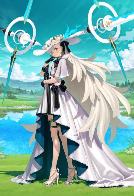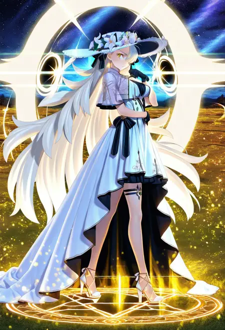 초기 initial: 1girl,10thOlga,fate,white hair,long hair,yellow eyes,gloves,dress,long hair,black gloves,hat,hair over one eye,high heels,hat flower,floating object, floating objects on both sides of the head,