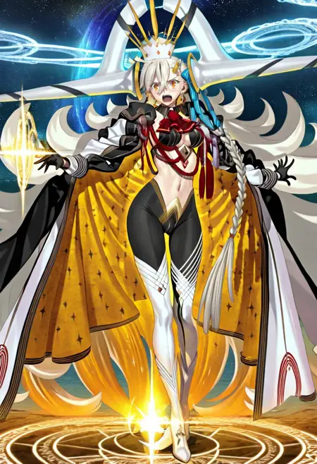U소장 U-Olga Marie: 1girl,10thOlga,U-Olga Marie,fate,white hair,long hair,yellow eyes,braid,earrings,navel,jewelry,red cravat,medal,white cape,black tights,black horns,crown,hat,gold stripes,black gloves,white boots,