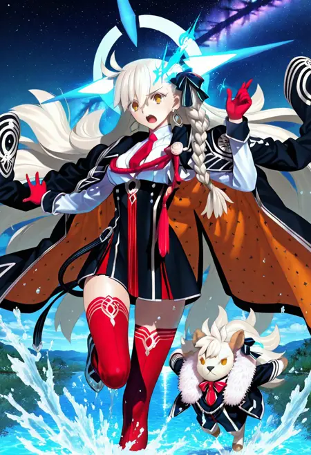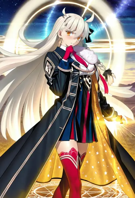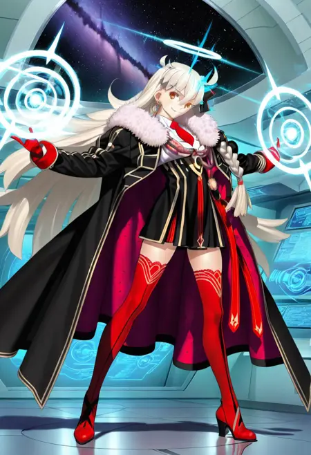 소장 OlgaMarie: 1girl,10thOlga,OlgaMarie Animusphere,fate,white hair,long hair,yellow eyes,braid,necktie,red gloves,hair between eyes,earrings,jewelry,Plush collar, red stockings,White stripes on stockings, red tie, white high heels,halo, belt, bow tie, blue headdress,Black coat,