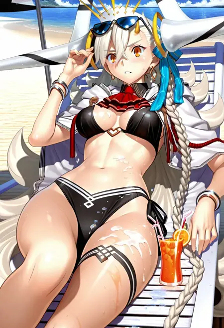 수영복 Swimsuit: 1girl,10thOlga,U-Olga Marie,fate,white hair,long hair,yellow eyes,Swimsuit, black bikini, white cape, summer, braids, sunglasses, ribbon, bracelet,