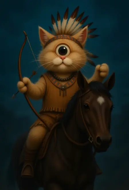 'grimmscat, a tiny, anthropomorphic kitten with a single, oversized eye in the center of its forehead.'