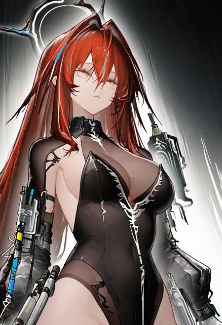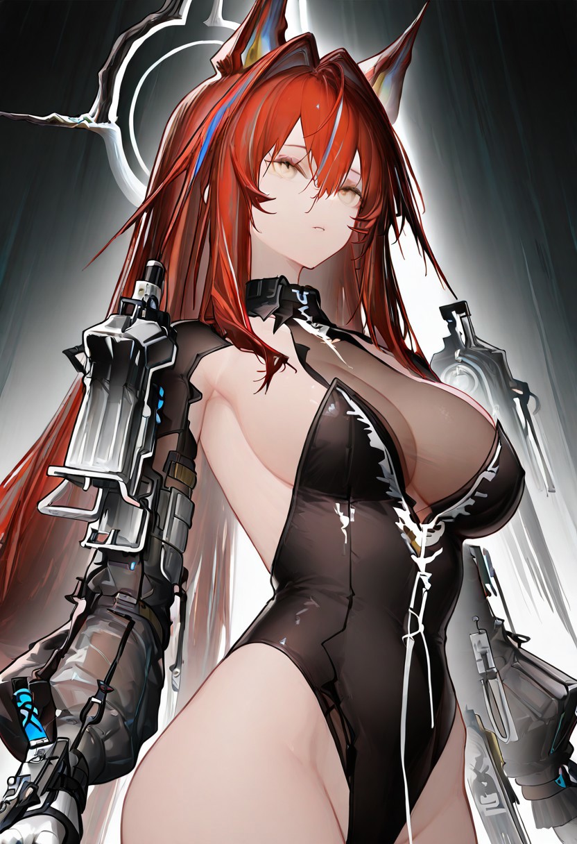 ember_\(arknights\), red hair, white gloves, long sleeves, cleavage, large breasts, yellow eyes, black leotard, sideboob, halo, see-through