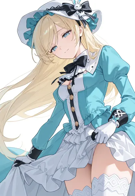 長い髪、金髪、流れる前髪、青い目、白い帽子、帽子のリボン、黒いリボン、フリル付き帽子、帽子の下のフリル、青いフリル、ウサギの帽子飾り、黒いリボン、帽子に結ばれたリボン、青いドレス、胸元、中程度の胸、胸元の切り替え、カラー付きドレス、長袖、ジュリエット袖、ふくらはぎ袖、白いカラー、白いクラバット、黒いボウタイ、白いアスコット、金色のボタン、ウエスト下のフリル、白いスカート、レース付きスカート、短いスカート、長いストッキング、太ももハイ、黒いメリー・ジェーンズ、黒い袖口、白い手袋、黒い指先、