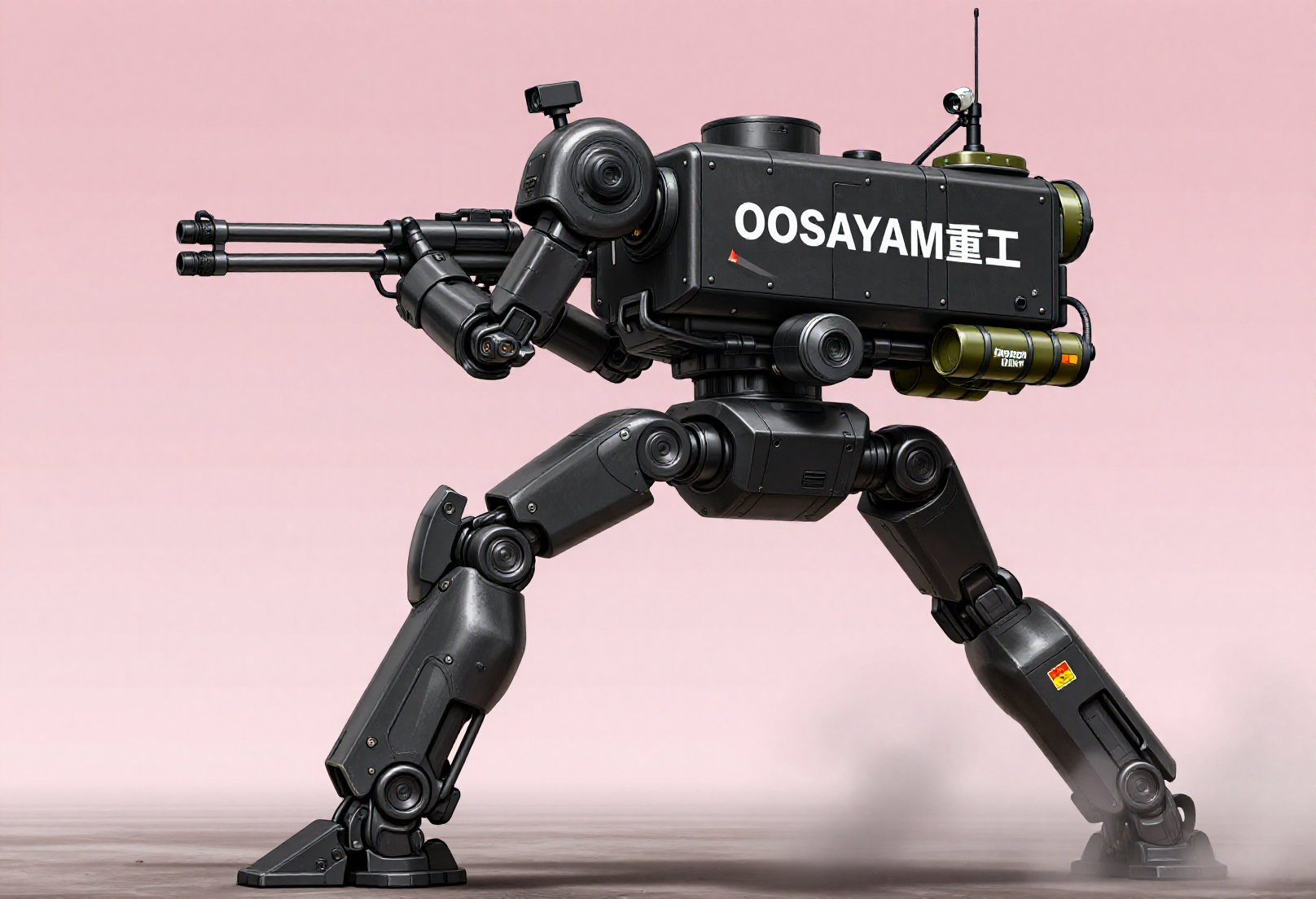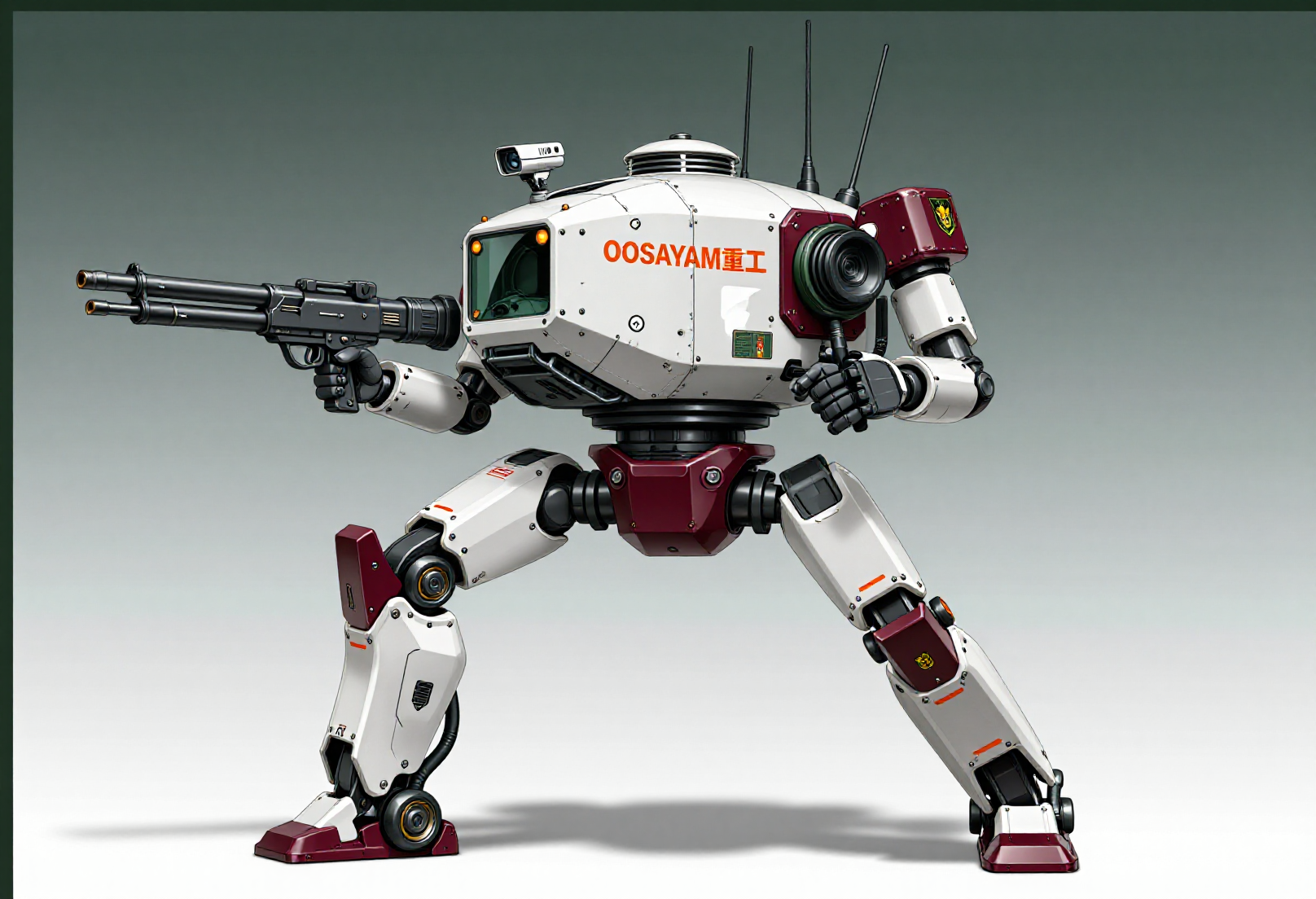 {1-2$$ machine_gun, |missile pod| rocket_launcher, | gatling_gun, | Turret }{1-2$$ radio_antenna, | Surveillance camera | Crash barrier | Rivet | Maintenance cover | Power hose | Hydraulic lever | Military badge } dynamic pose, fighting stance, dutch angle Warning sign, White markings