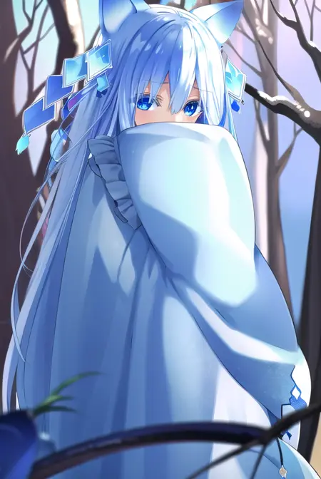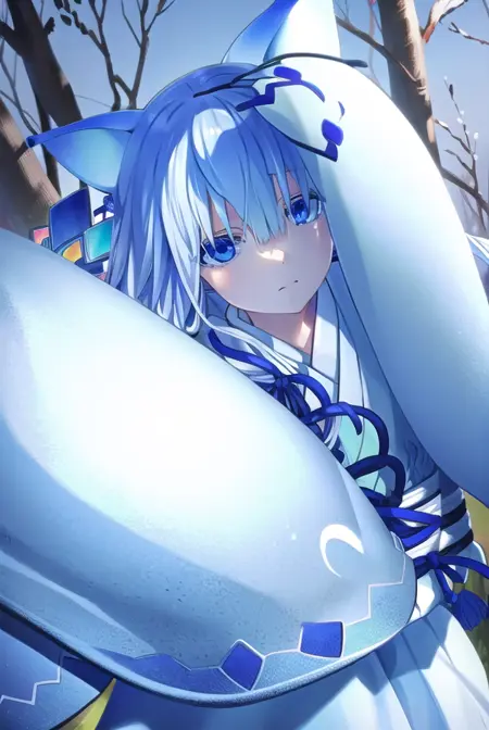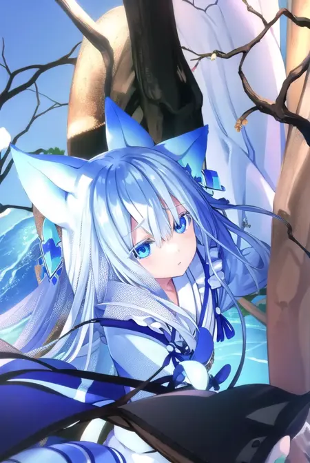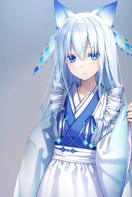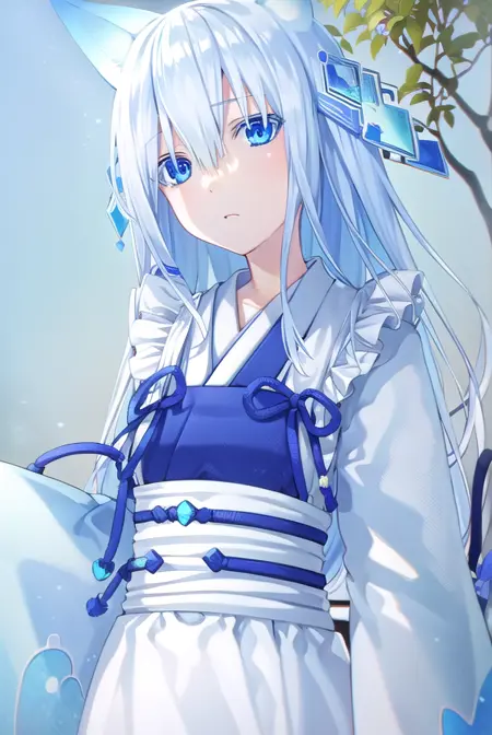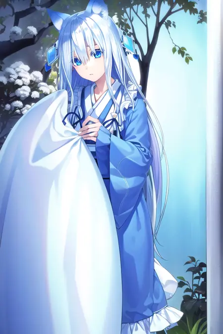 fffkarin, 긴 머리, 파란 눈, 머리 장식, 동물 귀, 흰 머리, 여우 귀,