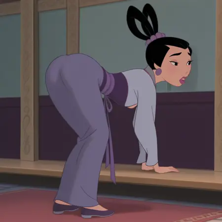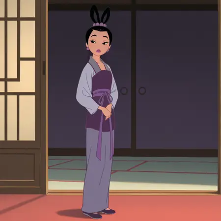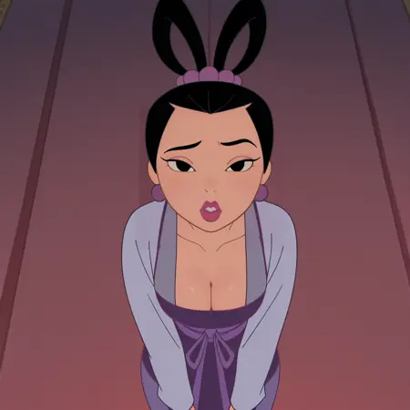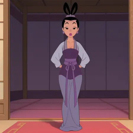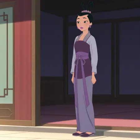 TAGS: long black hair, asian, slanted eyes, hair bun, traditional chinese clothes, purple sash, long sleeves, purple hair ornament, purple dress, lavender hanfu, black eyes, lipstick, sash belt