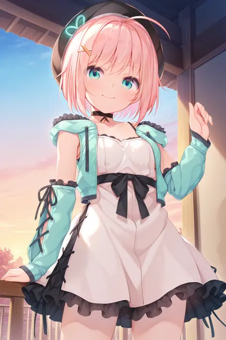 | 训练词汇 | kanata, blue_eyes, green_eyes,pink_hair, short_hair, ahoge,已复制! x_hair_ornament, hair_ornament,heart, hairclip, beret, choker,white_dress, sleeveless_dress, suspender_skirt,frilled_dress, bow, black_ribbon, frills, ribbon, short_dress, aqua_jacket, open_clothes, sleeveless_jacket, open_jacket, detached_sleeves,已复制! black_headwear, sandals, green_bow,已复制! |