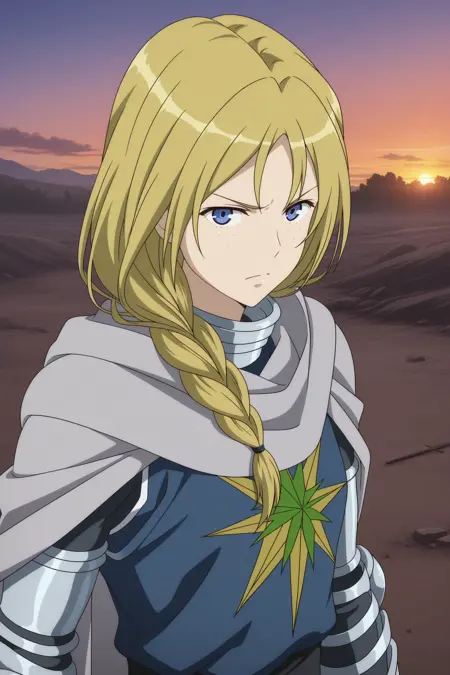 onna kishi, 长发, 金发, 单辫子, 发圈, 发丝垂肩, 分开的刘海, 蓝眼睛, 雀斑, 灰色斗篷, 盔甲, 肘甲, 手臂护具, 手套, 黑色手套, 蓝色紧身衣, 臀部遮帘, 硬质靴子