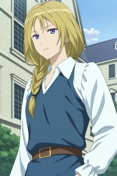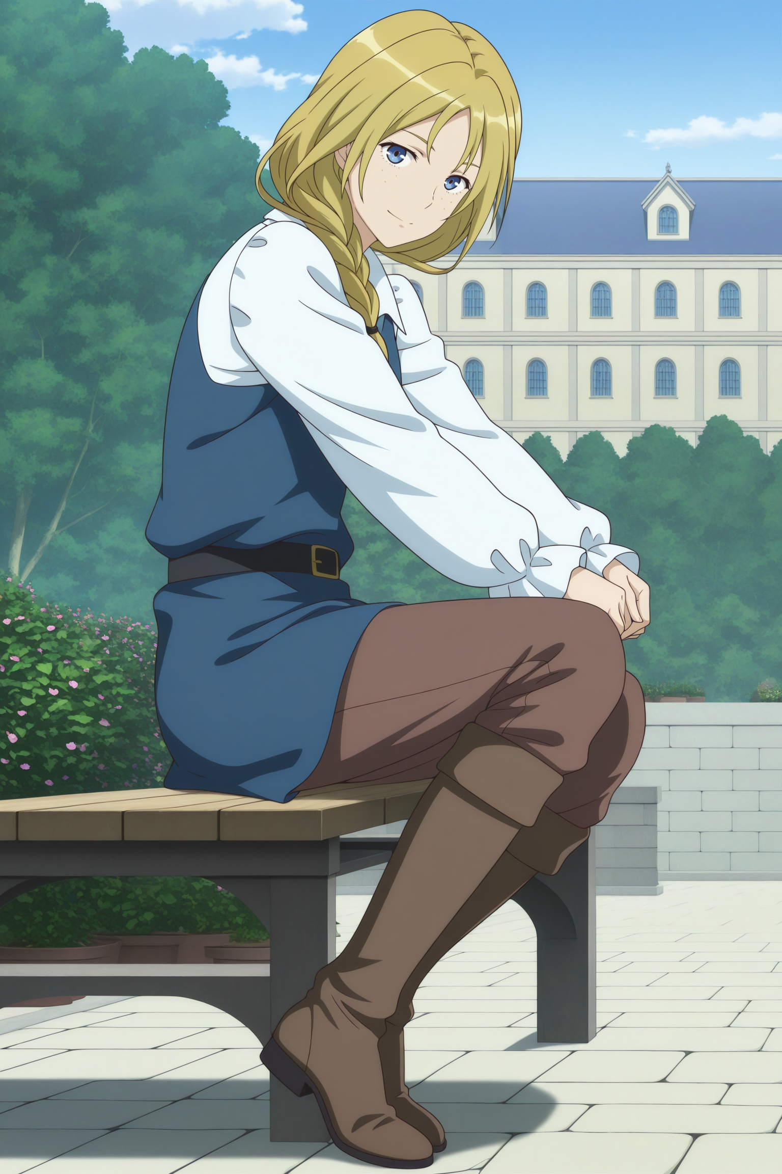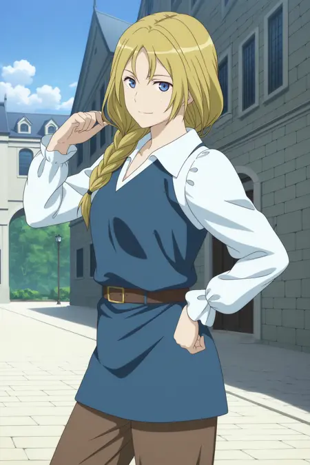 onna kishi, 长发, 金发, 单辫子, 发圈, 发丝垂肩, 分开的刘海, 蓝眼睛, 雀斑, 长袖, 白色衬衫, 带领子的衬衫, 蓝色紧身衣, 腰带, 棕色长裤, 棕色鞋子, 过膝靴