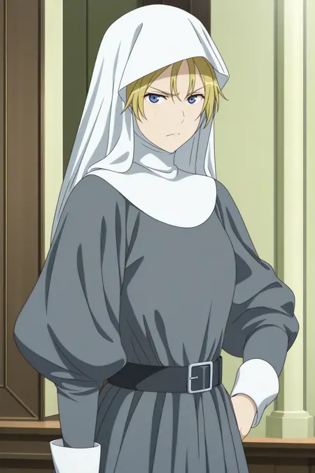 onna kishi, long hair, blonde hair, single braid, hair tie, hair over shoulder, parted bangs, blue eyes, freckles, puffy long sleeves, sleeve cuffs, nun, grey dress, long dress, guimpe, belt, black footwear