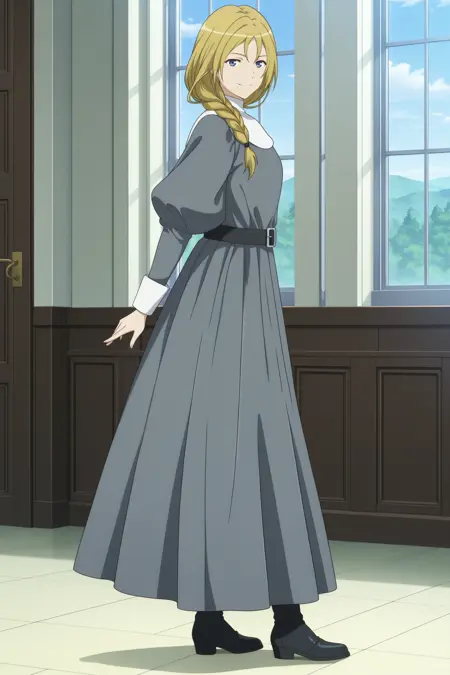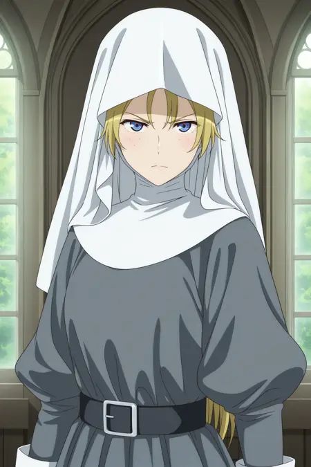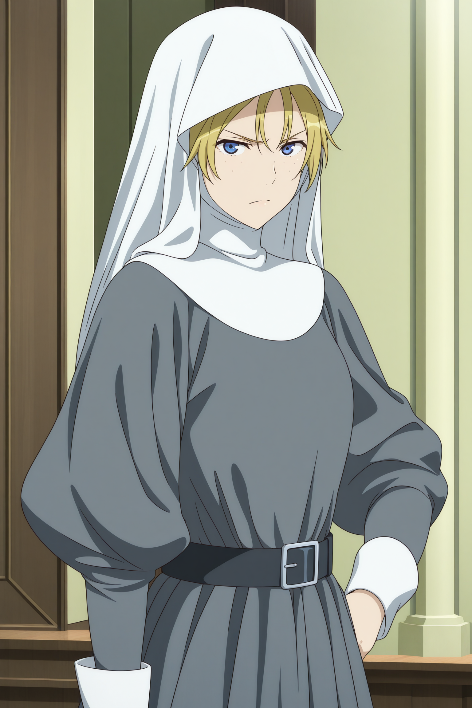 onna kishi, 长发, 金发, 单辫子, 发圈, 发丝垂肩, 分开的刘海, 蓝眼睛, 雀斑, 蓬松长袖, 袖口, 修女, 灰色长裙, 长裙, 面纱, 腰带, 黑色鞋子
