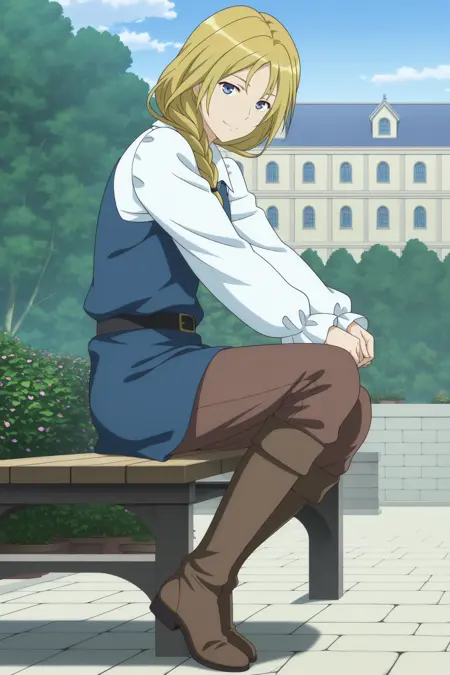 onna kishi, long hair, blonde hair, single braid, hair tie, hair over shoulder, parted bangs, blue eyes, freckles, long sleeves, white shirt, collared shirt, blue tunic, belt, brown pants, brown footwear, knee boots