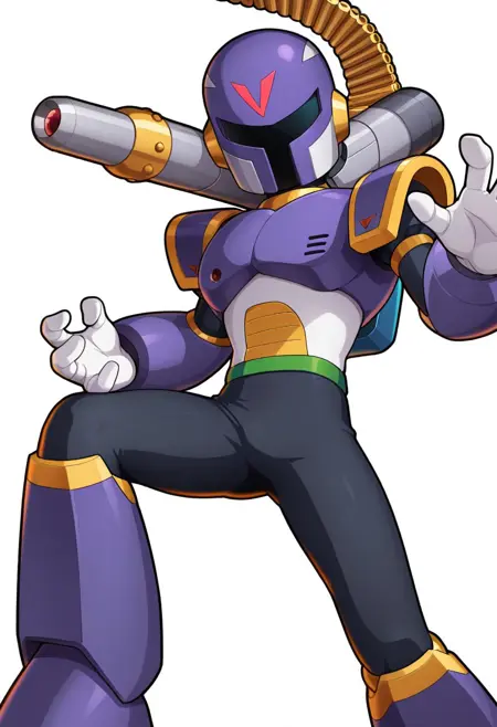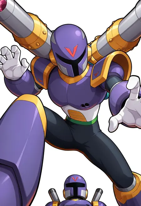 VileX,1个男孩,紫色头盔,无面孔,肩上配备火炮,紫色盔甲,白色手套,安卓机器人,紫色靴子,黑色紧身衣,