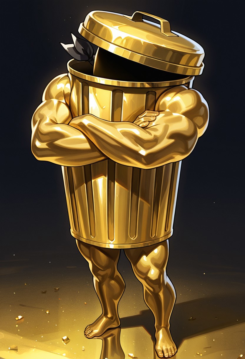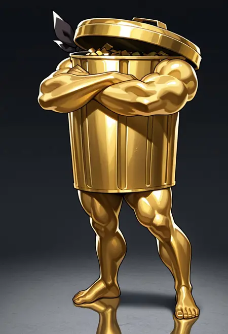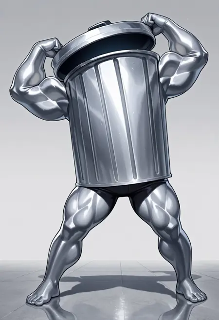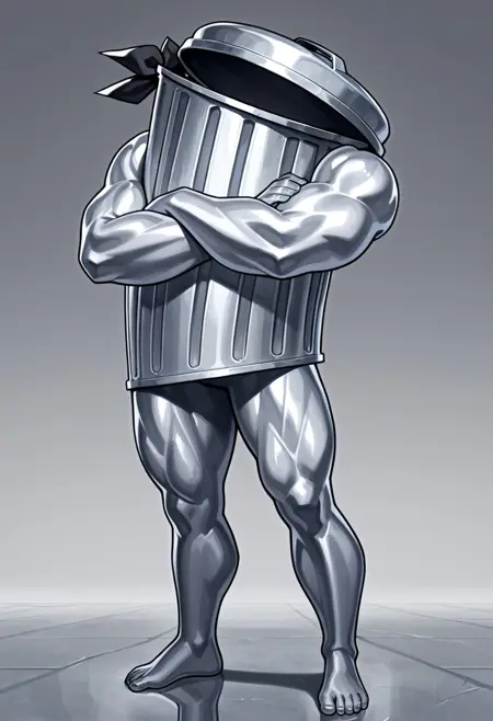 | 训练词汇 | strtr01, muscular human arms, muscular human legs, metal trash can body, round trash can lid on head, lid slightly open, silver metallic surface, reflective metal texture, black ribbon tied on lid hinge, crossed arms, bare feet, sculpted muscles, side grooves on body已复制! |