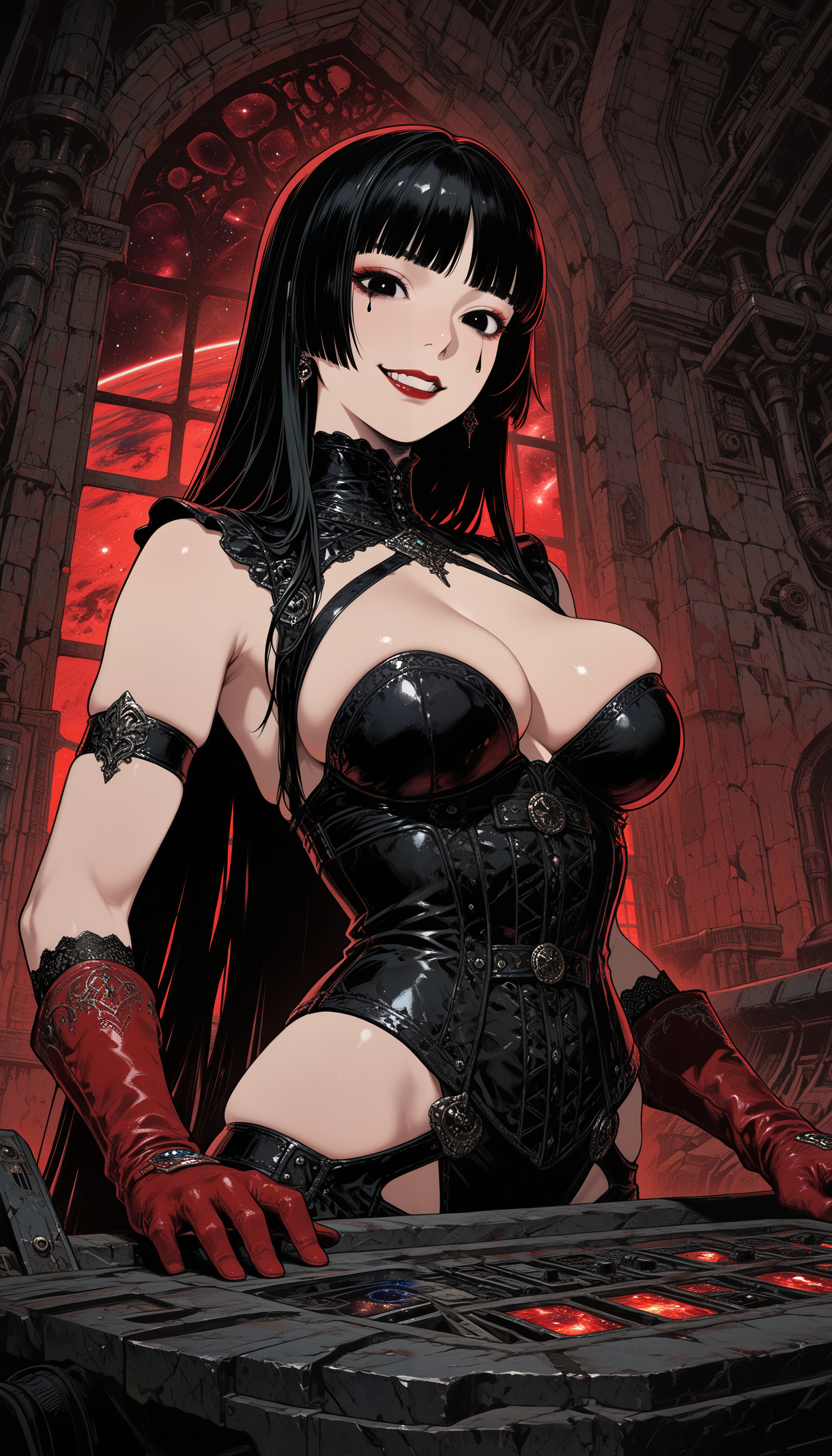 1girl, solo, vampire, long_hair, sitting_on_throne, looking_at_viewer, intricate_dress, wine_glass, castle_interior