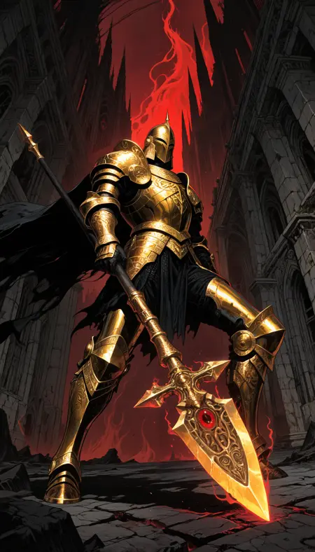 1girl, solo, knight, full_armor, holding_sword, dynamic_pose, battle_scream, from_below, dramatic_lighting, debris