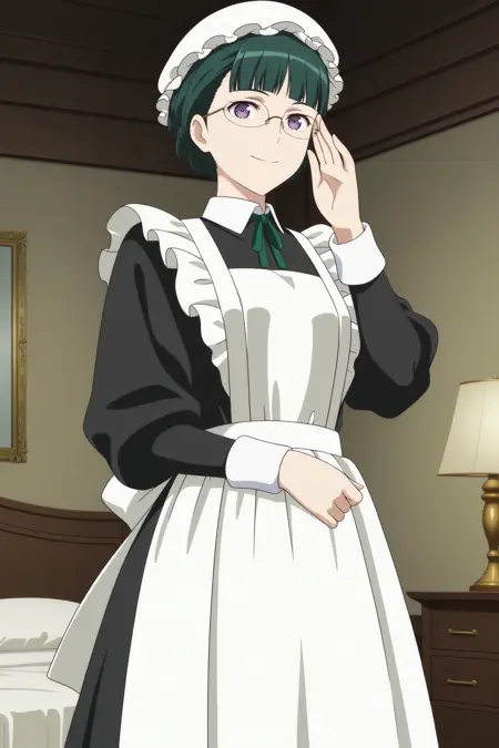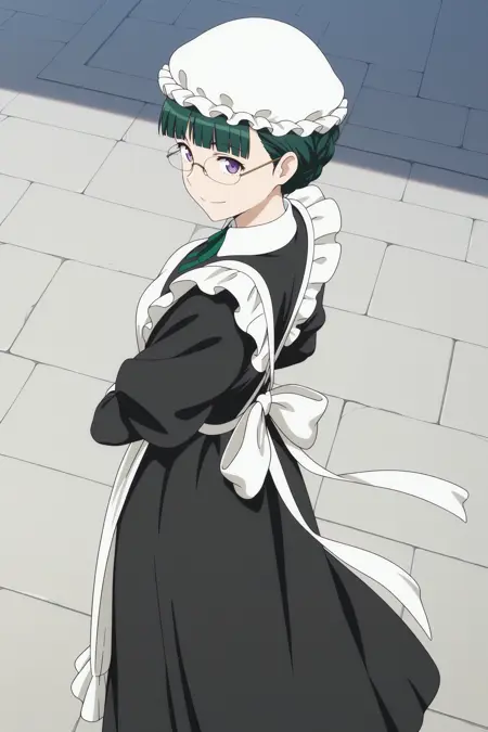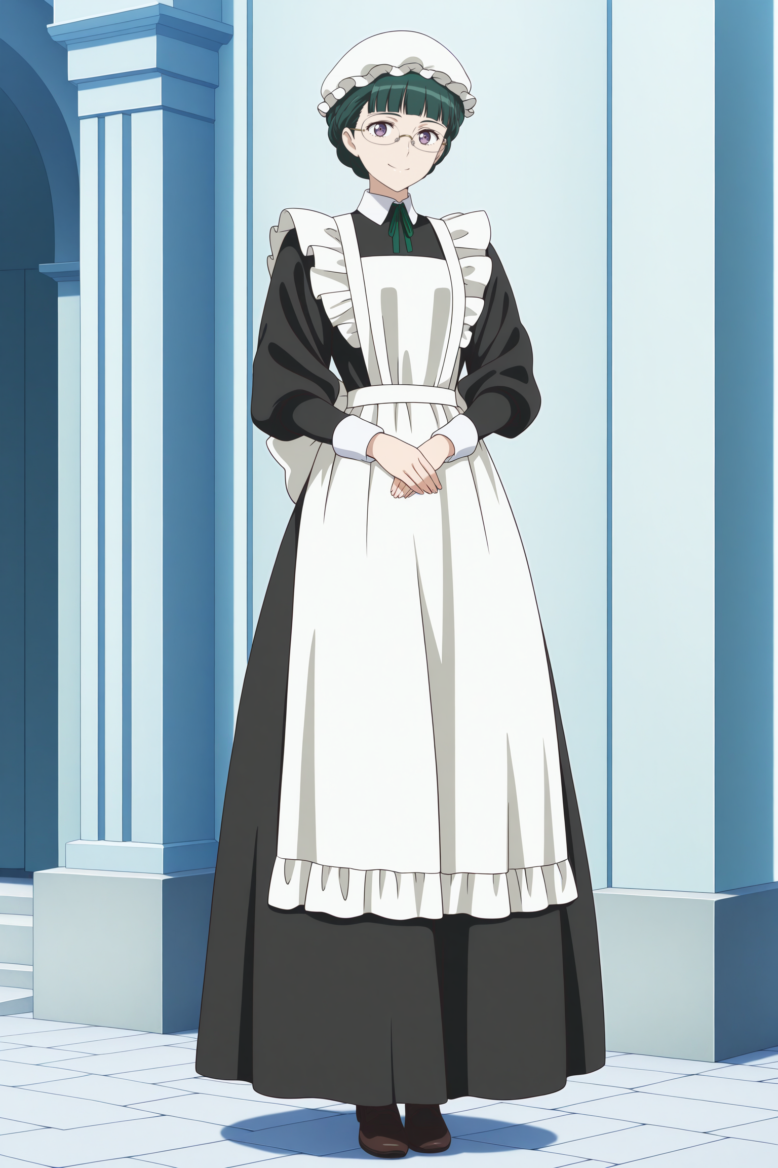 maid-chou, short hair, green hair, mob cap, bun with braided base, center-flap bangs, purple eyes, rimless eyewear, maid, long sleeves, black dress, long dress, maid apron, neck ribbon, green ribbon, back bow