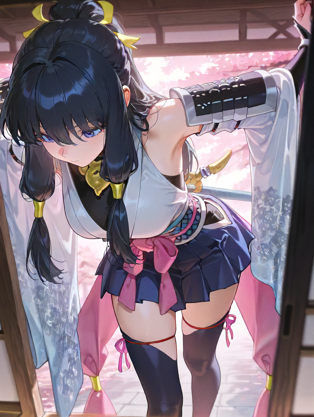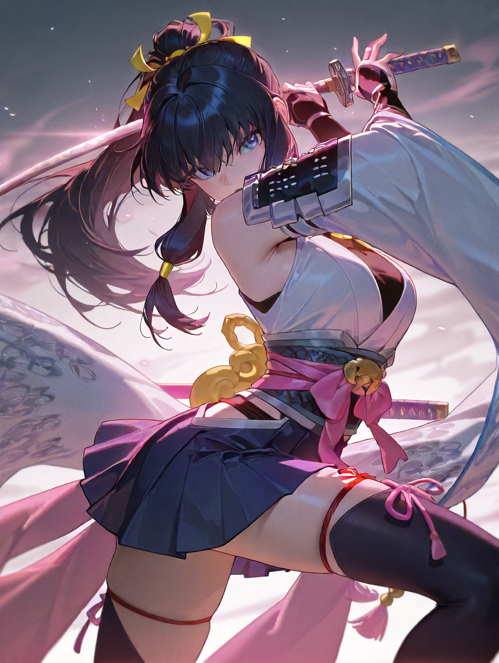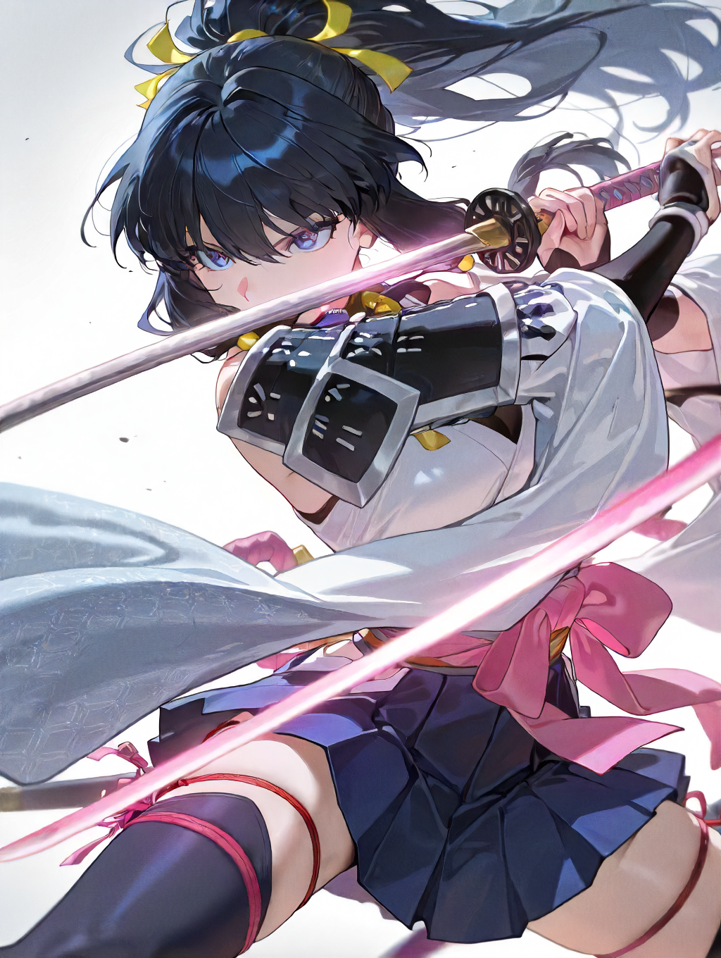 shigure(yasha), black hair, dark blue eyes, ponytail, japanese clothes, white haori, blue skirt, mini skirt, dark blue thighhighs, clothes cutout, yellow ribbon on hair, pink ornament, red rope on legs,